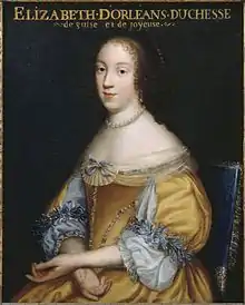Élisabeth d'Orléans was born in Paris at the Luxembourg Palace, then called the Palais d'Orléans, and now the seat of the Senate of France.[2] The palace had been given to her father on the death of his mother, Marie de' Medici in 1642. Élisabeth was known by her first name, Élisabeth, but she always signed Isabelle. One of five children, she was not raised with her siblings but in a convent, because she was destined to become abbess of Remiremont and was styled as such.