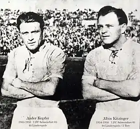 At that time, FC 05 midfielders Albin Kitzinger and Andreas 'Ander' Kupfer became renowned in international football as they formed one of the best half-back duos in Europe. Kitzinger distinguished himself with assuredness on the ball and the calmness in which he distributed the ball. Kupfer was a player that fascinated the crowds with his elegant ways of playing. He was a master of kicking the ball with just moving his ankle joint.[12] Kitzinger and Kupfer were an essential part of the famous Germany national team who defeated Denmark 8–0 in Breslau on 16 May 1937.[2] One year later they competed at the 1938 FIFA World Cup in France, and were both called up to represent Germany within the FIFA selection Europe XI in the FA 75th anniversary game against England at Highbury in London.