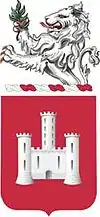 - Shield- Gules, a triple-towered castle (from the arms of St. Dizier, France) Argent.