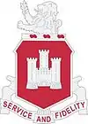 The silver triple-towered castle, taken from the arms of St. Dizier in France, denotes the battalion's World War I service. The shield is red and the charge is white, the colors of the U.S. Army Corps of Engineers. The crest is that of the Indiana Army National Guard.