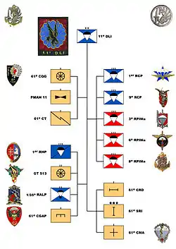 The 11th Parachute Brigade originally the 11th Light Intervention Division (11e DLI) was created from airborne units contingents of the 10th Parachute Division 10e D.P and 25th Parachute Division 25e D.P of France,[1] both dissolved following the Algiers putsch of 1961 during the Algerian War.