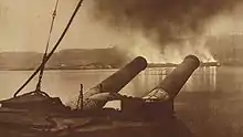 View of Gallipoli from the battleship HMS Cornwallis. The smoke is coming from stores being burned during the evacuation.