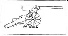 The gun was placed on a wooden platform, consisting of three layers of beams (deals) each measuring 7,5 cm by 7,5 cm by 4,5 m. The size of the platform was 4,5 m by 4,5 m by 22,5 cm. The layers were placed at right angles to one another. The platform weighed 5,200 kg. The platform had to be placed level in all directions to ensure that the range did not change when the gun pointed in a different direction.[1]:p. 165 Near the "front" of the platform a pivot plate was securely attached to the platform. Recoil was controlled by a hydraulic cylinder which connected the trail to the pivot plate. Chocks were also placed behind the wheels to limit recoil.[1]:p. 164