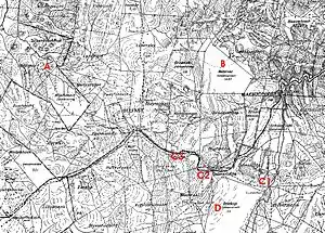 Gun C. Initially this gun was mounted on a railway truck. Around 7 August it was moved to the Elandskop vicinity.[13] This emplacement, marked "C1", is situated at 25°46'13"S, 30°12'50"E (WGS84). Before 23 August the gun was moved to a place south-west of Dalmanutha station ("C2")situated at 25°46'14"S, 30°09'05"E [WGS84].[14] Thereafter it was moved to hill 1881 behind the ZARPs (C3) at 25°44'10"S, 30°07'00"E (WGS84) .[13] After the battle it fled past Helvetia to Lydenburg and from there over the pass to Spitskop, Ohrigstad and eventually to Haenertsburg.[1]:pp.119–128
