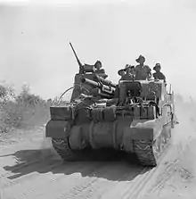 On 1 September 1944, 36th Indian Division was redesignated as a British division, the majority of the Indian Army units having been transferred.[11][14][18][23] The gunners of the rest of 178th Assault Fd Rgt were flown into Burma to join the division on 15 October (321 A/T Bty having returned unused to Shillong in September).[11][20] When NCAC began its post-Monsoon offensive on 16 October 1944, 36th Division was the only formation in contact with the enemy, and was the first to run into heavy opposition on 25 October, at a Japanese defensive position that blocked all roads. This was broken through on 29 October and Mawlu occupied on 31 October, but then the Japanese began to raid the division's precarious supply route and the advance halted until the following Chinese division broke through to Mawlu. Resuming its advance along the railway corridor, 36th Division captured Pinwe on 30 November, and occupied Indaw, Naba and Katha, reaching the Irrawaddy and Shweli Rivers without opposition during December. It continued to push along the river valleys in January 1945, meeting occasional rearguards, until it found the river crossing on the Shweli bend at Myitson to be strongly held.[24][25]