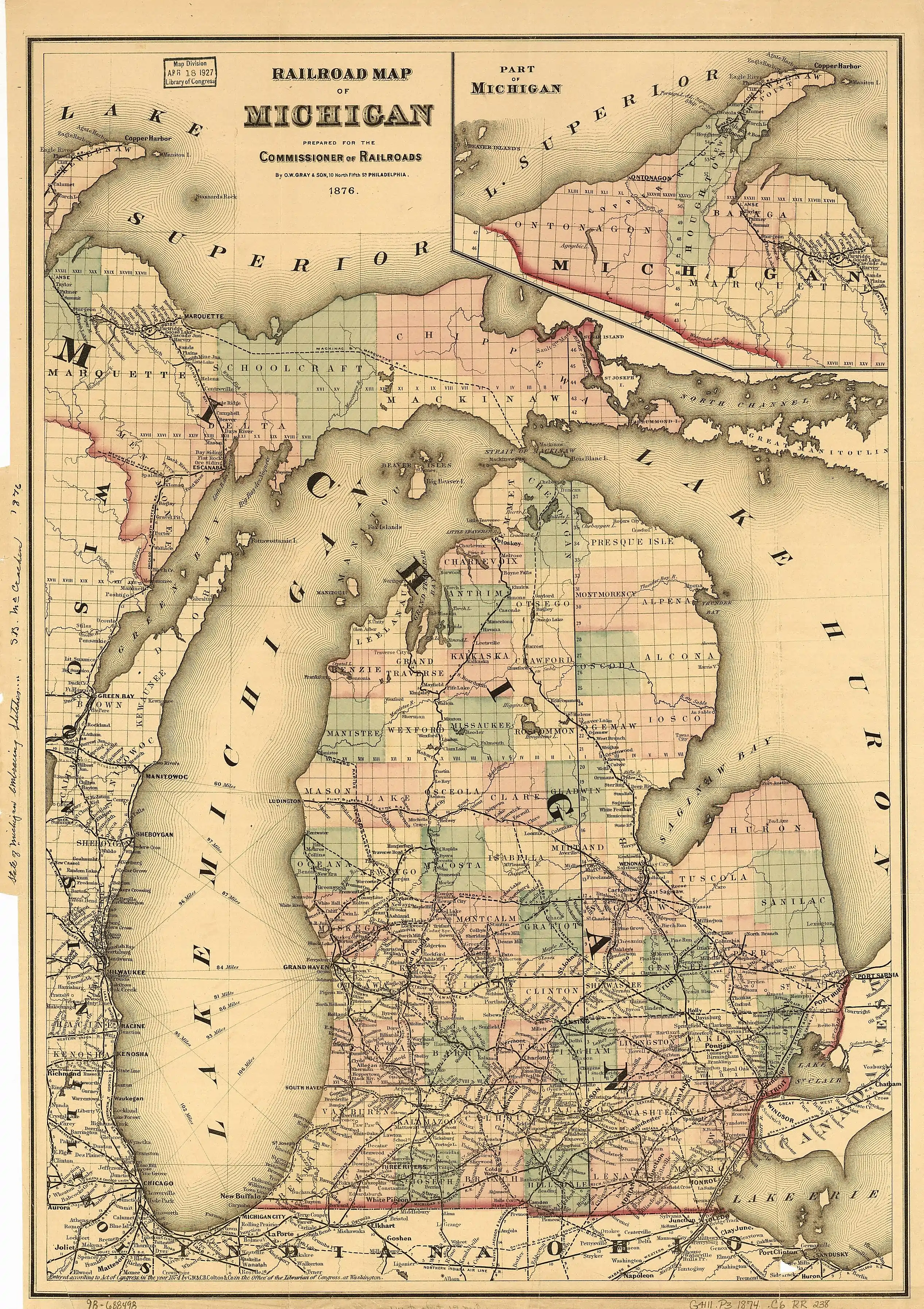 In 1873, railroads connect Northern Michigan port cities of Ludington, Traverse City and Petoskey. By 1880 the Great Lakes region would dominate logging, with Michigan producing more lumber than any other state.[2]
