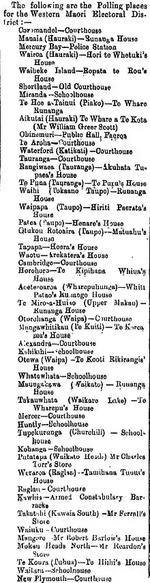 - "The Western Maori Electoral District". Wanganui Herald. XX (6087). 2 December 1886. p. 3. Retrieved 16 March 2014.