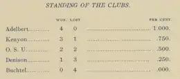 This season was very uneven for Ohio State. Richard T. Ellis was elected captain at the beginning of the season, but he broke his leg during the game against Adelbert College (the undergraduate college of Western Reserve University). Frank Haas served as captain during the Kenyon game. Baseball captain George Pearce took over the football team for the Denison game on Thanksgiving. The Denison game gave Ohio State its first victory since their first-ever game on May 3, 1890.[1]