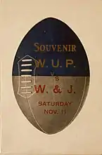 The WUP lineup for the game against Washington & Jefferson was Ted Perry (left end), Gilbert Miller (left tackle), Waldy Zieg (left guard), Arthur McKean (center), Joe Edgar (right guard), Calvin Marshall (right tackle), Walter East (right end), Frank Griggs (quarterback), Jud Schmidt(right halfback), Art Griggs (left halfback), and Winfred Banbury (fullback). Substitutions made during the game were: Leslie Waddill replaced Waldy Zieg at left guard; John Sullivan replaced Art Griggs at left halfback; Joe Thompson replaced John Sullivan at left halfback; Omar Mehl replaced Winfred Banbury at fullback; Quince Banbury replaced Walter east at right end; and Fred Klawuhn replaced Jud Schmidt at right halfback. The game consisted of thirty-five minute halves[10]