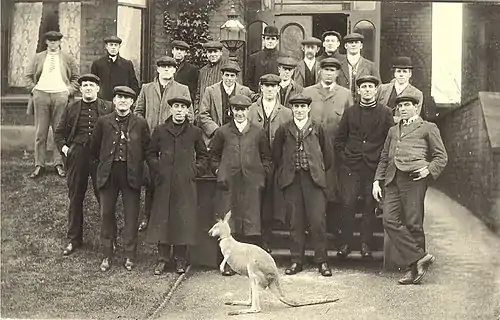 The Kangaroos sailed for Britain on RMS Macedonia prior to the close of the 1908 NSWRFL season, denying some of the selected players to appear in the inaugural grand final.[3] They worked as stokers to keep their fitness levels up as well as doing daily sessions in the ship's gymnasium and boxing ring. The jerseys were coloured sky blue and maroon, combining the state colours of NSW and Queensland respectively. When tour captain, Lutge was injured early in the tour, Messenger became captain in the 1st and 2nd Test Matches. After he was injured, Alec Burdon assumed the captaincy for the 3rd Test. One of the players Pat Walsh sailed to Britain separately on the ship, Salamis and brought the live Kangaroo mascot with him. Walsh arrived in England for the 5th match of the tour against Salford.The team's live marsupial mascot died before the end of the tour due to the execrable weather.[4]