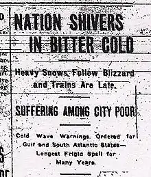 - "COLD WAVE IN AMERICA". The Mercury. Hobart, Tasmania, Australia. January 10, 1912. p. 5. Retrieved January 28, 2018 – via National Library of Australia.