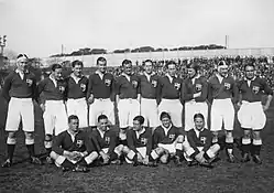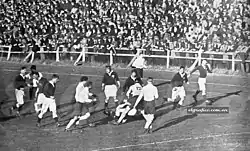 The following game was the first test v. Argentina, played on 31 July at Gimnasia y Esgrima stadium. It was the first time Argentina wore the horizontal light blue and white jersey (after wearing blue and white jerseys alternatively since its first match in 1910) after a proposal by Gimnasia y Esgrima executive Abelardo Gutiérrez.[5] The match was attended by a record 12,000 spectators. After the match, MacMyn wrote: "The crowd was delighted. They were impressed by the fact that we played in silence, listening only to the captain's voice. Argentines have all the physical qualities required for rugby. They are big, strong and fast. They are tremendously enthusiastic –sometimes, excessively".[4]
