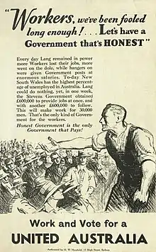The 29th parliament of New South Wales was dissolved on 18 May 1932 after the Governor, Sir Philip Game dismissed the Premier Jack Lang (see the crisis of 1931–32) and commissioned Bertram Stevens to form a caretaker government. Lang's government had a majority of 20 at the time of the dismissal. In this election, the Australian Labor Party (NSW) and the Federal Executive of the Australian Labor Party, which had separated in 1931 (see Lang Labor), endorsed separate candidates. The ALP (Federal) had candidates in 43 seats but none were elected. The parties were re-united in 1936. The campaign was marked by mass Labor Party public meetings including, allegedly, the largest public meeting in Australian history when Lang addressed 200,000 people at Moore Park on 5 June.