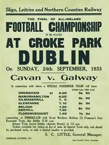 In 1933 Cavan beat Galway in the final by 2 – 5 to 1 – 4, but in defeat the Galway team were hailed as a major force for the future, a prediction that turned out to be accurate as they beat Dublin the following year by 3 – 5 to 1 – 9, the first Galway team to wear the maroon and white colours and the first Galway team to bring the Sam Maguire west. The crowd at the game numbered 36,143.