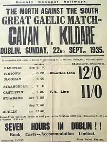 Cavan won by four points after Kildare centre back Jack Higgins was injured. The Lilywhites (Kildare) would not reach the All-Ireland final again for another sixty-three years.[1] They also lost that final, this time to Galway, in 1998.[2][3]