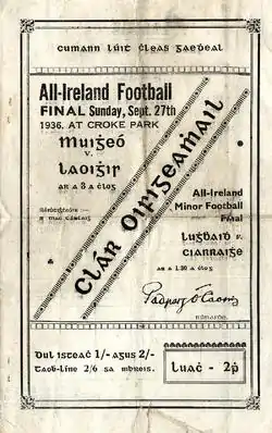 The 1936 All-Ireland Senior Football Championship Final was the 49th All-Ireland Final and the deciding match of the 1936 All-Ireland Senior Football Championship, an inter-county Gaelic football tournament for the top teams in Ireland. Seamus O'Malley, a native to Lavalley, Ballinrobe Co.Mayo was captain of the victorious team. Paddy Munnelly scored a hat-trick as Mayo coasted to an easy victory. Laois's Bill Delaney played with two broken bones in his foot.[2][3]