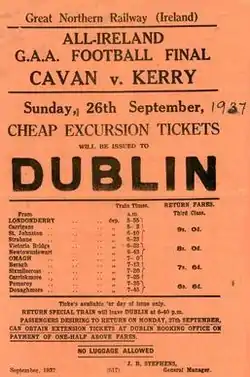 The Radio Athlone commentator mistakenly announced Cavan as the winners of the first game; Packie Boylan's late point had been disallowed. Kerry won the replay by six points, with goals by Timmy O'Leary (2), Miko Doyle and John Joe Landers.[1]