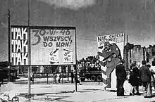 The People's Referendum (Polish: referendum ludowe) of 1946, also known as the Three Times Yes referendum (Trzy razy tak, often abbreviated as 3×TAK), was a referendum held in Poland on 30 June 1946 on the authority of the State National Council (order of 27 April 1946). The referendum presented an opportunity for the forces vying for political control of Poland following World War II to test their popularity among the general population. However, the results were forged and the referendum failed to meet democratic standards.[1][2]
