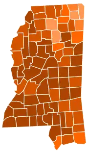 | Copiah | 2,523 | 95.90% | 19 | 0.72% | 89 | 3.38% | 0 | 0.00% | 2,434 | 92.52% | 2,631 |