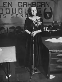 On October 5, 1949, Douglas made a radio appearance announcing her candidacy.[15] She attacked Downey almost continuously throughout the remainder of the year,[18] accusing him of being a do-nothing, a tool of big business, and an agent of oil interests.[19] She hired Harold Tipton, a newcomer to California who had managed a successful congressional campaign in the Seattle area, as her campaign manager.[20] Douglas realized that Nixon would most likely be the Republican nominee, and felt that were she to win the primary, the wide gap between Nixon's positions and hers would cause voters to rally to her.[18] Downey, who suffered from a severe ulcer, was initially undecided about running, but announced his candidacy in early December in a speech that included an attack on Douglas.[21] Earl Desmond, a member of the California State Senate from Sacramento whose positions were similar to Downey's, also entered the race.[22]