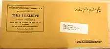 Downey reentered the fray on May 22, when he made a statewide radio address on behalf of Boddy, stating his belief that Douglas was not qualified to be a senator.[38] He concluded, "Her record clearly shows very little hard work, no important influence on legislation, and almost nothing in the way of solid achievement. The fact that Mrs. Douglas has continued to bask in the warm glow of publicity and propaganda should not confuse any voter as to what the real facts are."[39]