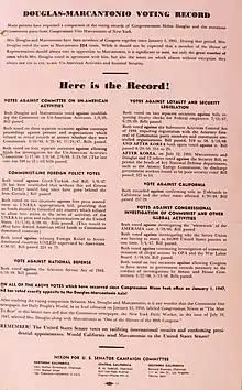 Nixon realized that the battle in California would be fought over the threat of communism, and his campaign staff began to research Douglas's voting record.[61] Republican officials in Washington sent the campaign a report listing 247 times Marcantonio (who generally followed the Democratic line) and Douglas had voted together, and 11 times that they had not.[69] Nixon biographer Conrad Black suggests that Nixon's strategy in keeping the focus on communism was to "distract [Douglas] from her strengths—a sincere and attractive woman fighting bravely for principles most Americans would agree with if they were packaged correctly—to scrapping ... on matters where she could not win."[70] Chotiner stated 20 years later that Marcantonio suggested the comparison of voting records, as he disliked Douglas for failing to support his beliefs fully.[71]