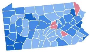 This is the only occasion since 1856 when Lancaster County has not voted for the Republican presidential candidate, and was the first time since that election when suburban Delaware County had not voted Republican.[11] 7 other counties – Somerset, Butler and the northern bloc of Bradford, Tioga, Potter, Cameron and McKean – also cast their solitary vote for a Democratic presidential candidate since at least the Civil War. In addition to these counties voting Democratic for the solitary occasion since the Civil War, a large bloc of Appalachia and adjacent areas – comprising York County, Cumberland County, Franklin County, Adams County, Blair County, Lycoming County, Northumberland County, Bedford County, Clarion County, Crawford County, Fulton County, Huntingdon County, Pike County, Venango County, Mifflin County, Perry County, Jefferson County, Susquehanna County, Wyoming County, Juniata County, Montour County, and Sullivan County – have never voted for a Democratic candidate since.[9]