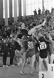 Věra Čáslavská and the Czechoslovak team celebrating their victory.