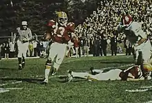 In the final regular season game, Iowa State was upset on the road 14–27 by Pacific Coast Athletic Association champions San Diego State, who were 22-point underdogs.[57] The momentum of the game shifted on the first play of the fourth quarter when a 45-yard Goedjen field goal attempt was blocked by Joe Lavender and returned for a touchdown by Bill Ferguson, tying the game at 14. Phil Danowsky returned the kickoff but fumbled the ball, which was recovered by Ken Jackson to give San Diego State excellent field position at the Iowa State 39-yard line. In three plays, San Diego State quarterback Jesse Freitas passed to Isaac Curtis for the touchdown, giving the Aztecs a 21–14 lead.[58] The Aztecs clinched their victory with 4:56 left in the game after Rick Ash intercepted Amundson on the Iowa State 30, and Frank Miller ran for a 1-yard touchdown in four plays to finish the San Diego State scoring drive.[59] The Cyclones thus finished the regular season with a 5–5–1 record.[60]