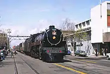 An excursion train pulled by a classic BC Rail steam locomotive visits Oakland, California in 1977
