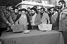 Ruhollah Khomeini and his son Ahmad Khomeini voting in the 1982 Assembly of Experts.