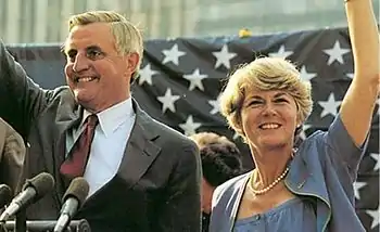 A very significant political move during this election: the Democratic Party nominated Representative Geraldine Ferraro to run with Mondale as Vice-President. Ferraro is the first female candidate to receive such a nomination in United States history. She said in an interview at the 1984 Democratic National Convention that this action "opened a door which will never be closed again,"[5] speaking to the role of women in politics.