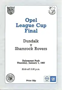 The League Cup was the first trophy of the 1986–87 League of Ireland season. Its first round, in which four teams played each other in a double round-robin system, took place before the start of the league schedule. The two sides had met twice already that season, with Shamrock Rovers winning both the President's Cup final and the league fixture in Milltown.[1] Dundalk had last won the competition in 1981. They reached the final by topping their group over Cork City, Drogheda United and EMFA, and then defeating St Patrick's Athletic (in a penalty shoot-out after a 0–0 draw) and Athlone Town (1–0).[2]