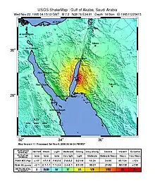 The 1995 Gulf of Aqaba earthquake (also known as Nuweiba earthquake) occurred on November 22 at 06:15 local time (04:15 UTC) and registered 7.3 on the Mw scale. The epicenter was located in the central segment of the Gulf of Aqaba, the narrow body of water that separates Egypt's Sinai Peninsula from the western border of Saudi Arabia. At least 8 people were killed and 30 were injured in the meizoseismal area.