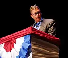 Serna successfully won the Democratic nomination at the meeting, with 67 out of the 81 votes cast.[29][30] 23 of the votes out of the total of 81 were cast by proxy, meaning that the central committee member did not attend in person.[30] Justice Sosa, Jr. received 8, Mayor Jaramillo received 2, former Governor Lovato received 2, and Lobato received 0.[30] At 10AM, three hours before the meeting even started, a large sign announcing Serna as the Democratic nominee appeared outside the hotel the vote was taking place in.[30] Upon receiving the nomination, Serna called for unity between Greens and Democrats at a press conference, reminding voters of the 1994 New Mexico gubernatorial election where the Green Party played spoiler to Democratic gubernatorial ambitions.[31]
