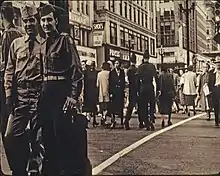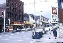 After World War II, 1st Avenue was nicknamed "Flesh Avenue",[13] and from the 1950s to the 1980s, police raids at peep shows and other adult-oriented businesses in the First and Pike Street block were frequent and the corner was called a haven for "street crazies and druggies, prostitutes, players and partyers".[14] The Seattle Times said in 2006, "For decades, the Pike-Pine corridor between First and Third avenues has been known for run-down buildings, parking lots prone to drug deals and heroin addicts ... effectively a dam separating Pike Place Market and its 9 million annual visitors from the city's shopping and convention areas".[15] 1st Avenue between Bell and Blanchard, where Belltown meets Downtown, was ranked as Seattle's third most dangerous block in 2013, with 135 violent crimes reported.[16]