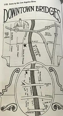 Walking through these historic bridges in Downtown Los Angeles since 1910 to the 1930s had been a leisure and pastime for some people. In the book Down By The Los Angeles River written by Joe Linton he narrates the readers on a walking path starting from First Street Bridge.[5] LA voters in 1924 passed the Viaduct Bond Act that would allocate 2 million dollars through a tax, the funds allocated would go towards revitalizing the Downtown Los Angeles Bridges.[5]The friends of the Los Angeles River mobilized the La Gran Limpieza to clean up the Los Angeles River with an educational feature where they invited elementary, middle, and high school students.[6] A collaboration the friends of the Los Angeles had was with the Los Angeles Conservation Corps’ Clean & Green program that monitored the water quality at the rivers monthly.[7] Under their collaborated event efforts activities included cleaning up trash, science experiments, educational workshop, and familiarize participants with the L.A river bridges themselves since events would be facilitated there to create community identity.[8]
