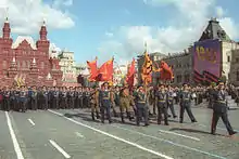 The parade was commanded by Colonel General Igor Puzanov, Commander of the Moscow Military District, and reviewed by the Minister of Defence, Marshal of the Russian Federation Igor Sergeyev. The historical part of the parade was commanded by the former Moscow Military District commander General of the Army Vladimir Govorov. A speech was made by the newly elected president Vladimir Putin. Unlike other jubilee parades, this one in particular did not see the attendance of foreign heads of state and government as well as foreign delegations.[1] This parade was the last to feature the old national anthem of Russia (used 1990-1991 by the Russian SFSR and 1991-2000 by the Russian Federation). It was also the last parade to feature veterans on foot.[2][3]