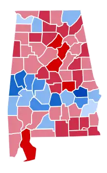 | Tuscaloosa | 60,114 | 24,614 | 40.95% | 34,003 | 56.56% | 251 | 0.42% | 193 | 0.32% | 18 | 0.03% | 1,007 | 1.68% | 28 | 0.05% | 0 | 0.00% |