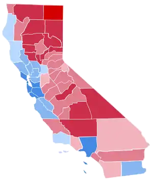 Vice President Al Gore easily defeated Texas Governor George W. Bush in California. Bush campaigned several times in California, but it didn't seem to help as Gore defeated Bush by 11.8%. Bush did make substantial headway in the Gold Country, Shasta Cascade, and parts of the Central Valley, flipping San Joaquin, Stanislaus, and Merced Counties (all of which had voted for Bill Clinton twice) and winning the highest vote share of any presidential nominee in decades (exceeding California natives Richard Nixon and Ronald Reagan) in Shasta, Madera, Tehama, Siskiyou, Lassen, Plumas, Modoc, and Sierra Counties. He also flipped San Bernardino County, his largest county flip in the state (and nationally), as well as Ventura County; but he underperformed in all the large, then-historically Republican counties of Southern California and the Central Coast (San Diego, Orange, Riverside, San Bernardino, Ventura, Santa Barbara, and San Luis Obispo) relative to Bob Dole's performance in 1996, losing Santa Barbara outright despite that Dole had lost it by only 4.5%.[2] In the then-Republican bastion of Orange County, Al Gore became the first Democrat to crack 40% since Lyndon Johnson's 1964 landslide.