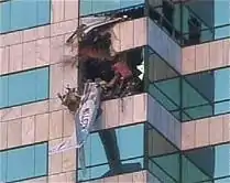 ![]() The plane's tail hangs from the Bank of America building in Tampa, Florida. | |