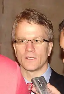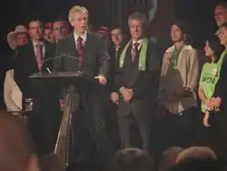 Former Liberal House Leader Don Boudria[32] served as Dion's Campaign Chair and Paul Martin's BC Lieutenant Mark Marissen was his National Campaign Director.[33] One-time Progressive Conservative leadership aspirant David Orchard also announced his support of Dion.[34] Additional high-profile supporters included then-leader of the Saskatchewan Liberal Party David Karwacki,[35] Jamie Elmhirst, the President of the British Columbia wing of the Party,[36] Adam Campbell, the President of the Alberta wing of the Party,[37] former Green Party of Canada deputy leader Tom Manley,[38] former Prime Minister Paul Martin's Chief of Staff Tim Murphy,[39] Herb Metcalfe, former John Manley Campaign Chair, and Marc-Boris Saint-Maurice the co-founder and former leader of the Marijuana Party of Canada.[40] Former Justice minister Allan Rock endorsed Dion on December 1.