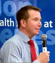 Scott Brison, 39, was the MP for Kings—Hants and was Minister of Public Works and Government Services under Martin. He had previously been a Progressive Conservative MP (since 1997) and had run for the leadership of the PC Party in 2003. Brison crossed the floor later that year to join the Liberals shortly after the creation of the Conservative Party of Canada. An openly gay former investment banker, Brison presented fiscally moderate and socially progressive positions. His PC leadership platform had called for Employment Insurance reform, more private involvement in healthcare, integrated defense strategy with the US, and socially liberal policies. His 2006 Liberal leadership platform emphasised the candidate as a "defender of the environment, business innovation and socially progressive values."[27]