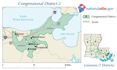 This staunchly liberal district, based mainly within the city of New Orleans, has elected Bill Jefferson to Congress consecutively since 1990. Seeking his ninth term in Congress, Jefferson was largely unpopular due to the fact that he was under federal investigation for corruption charges at the time, and therefore, a great many candidates emerged to challenge him. On the Democratic side, State Representative Karen Carter, State Senator Derrick Sheperd, New Orleans City Councilman Troy Carter, Orleans Parish School Board attorney Regina Bartholomew, John Edwards, Scott Barron, former congressional candidate Vinny Mendoza, and D.C. Collins ran. Republicans Joe Lavigne, an attorney; Eric Bradley; Lance von Uhde and Libertarian Rhumbline Kahn also ran, creating a very crowded race. On October 14, the Louisiana State Democratic party voted to endorse Karen Carter.[2] In the first line of balloting, no candidate received a majority of the votes, so the top two candidates, Jefferson and Carter, advanced to a second line of balloting, which Jefferson ultimately won by a comfortable margin, despite the corruption charges against him.