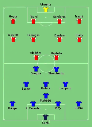 Chelsea were expected to line up in a 4–4–2 formation, with Essien in central defence.[32] They had doubts about the fitness of captain John Terry going into the final. He appeared to have damaged his ankle ligaments during the first leg of Chelsea's Champions League tie with Porto, though passed a fitness test just days after.[33] Arsenal were expected to line up in a similar formation, with Baptista and Aliadière up front.[32]