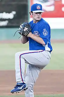 The supplemental pick was right-handed pitcher James Adkins from the University of Tennessee. He was a 1st team Freshman All-American at Tennessee in 2006 and was MVP of the Knoxville Regional at the College World Series. Adkins is Tennessee's all-time leader in strikeouts with 350 career strikeouts.[1] He played for the Great Lakes Loons of the Midwest League in 2007, starting 11 games for the Loons and finishing with an 0-1 record and a 2.42 ERA in 26 innings of work during his first season of professional baseball. In 2008, he was 5-8 with a 5.34 ERA for Single-A Inland Empire 66ers of San Bernardino and 1-3 with a 4.74 ERA in 8 starts for the Double-A Jacksonville Suns. He started 26 games for the Chattanooga Lookouts in 2009, with a 6-10 record and 4.48 ERA. He was converted exclusively to a reliever in 2010, making 40 appearances for the Lookouts and 5 for the Triple-A Albuquerque Isotopes. He was released by the Dodgers on April 5, 2011. He signed with the Cincinnati Reds on May 4, but was released in August.[2] After taking the 2012 season off, Adkins spent 2013 with the Grand Prairie AirHogs and Gary SouthShore RailCats, both part of the American Association of Independent Professional Baseball.