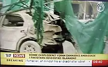 The 2008 Danish embassy bombing was an attack on the Danish embassy in Islamabad, Pakistan on 2 June 2008. The suspected suicide car bombing in the parking lot of the embassy took place at around 12:10 pm (UTC+5), killing at least six and wounding many more. The Danish national security intelligence agency PET concluded that al-Qaeda was behind the attack.[2] Al-Qaeda claimed responsibility for the attack on 5 June 2008. The attack was confirmed to be an answer to the reprinting of Danish newspaper Jyllands-Posten's Muhammed cartoons in February 2006, as well as the presence of Danish troops in Afghanistan.[3][4]