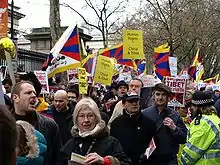 Several hundred pro-Tibet protesters gathered at the Trocadéro with banners and Tibetan flags, and remained there for a peaceful protest, never approaching the torch relay itself.[71] Among them was Jane Birkin, who spoke to the media about the "lack of freedom of speech" in China.[72] Also present was Thupten Gyatso, President of the French Tibetan community, who called upon pro-Tibet demonstrators to "remain calm, non-violent, peaceful".[73]