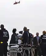 Immediately following the accident, the Coast Guard had reported that the New York City Fire Department (FDNY) had rescued one survivor from the Hudson River;[18] however, this report was shown to be incorrect. In addition to FDNY, six rescue boat crews from Coast Guard Station New York, a Coast Guard rescue helicopter crew from Coast Guard Air Station Atlantic City, several Coast Guard Auxiliary assets, the New York City Police Department (NYPD), New Jersey State Police, and local emergency services all participated in the rescue effort. The Red Cross and the New York Harbor Police also assisted in the efforts. At about 3:00 p.m., Michael Bloomberg, the mayor of New York, addressed questions in a press conference. Calling the crash "an accident which we do not believe was survivable," Bloomberg announced that the mission was no longer a rescue mission, but rather a recovery mission.[13]
