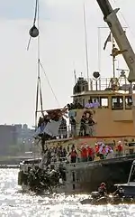 The efforts succeeded on August 10, when the plane's wreckage was discovered in approximately 60 ft (18 m) of water,[10] and was recovered from the river on the afternoon of August 11. Additionally, the last few bodies were found in the wreckage of the plane, ending the search for bodies.[20] The recovery effort was led by the United States Army Corps of Engineers with the aid of NYPD boats, New Jersey State Police divers, and the FDNY.[19][21][22]